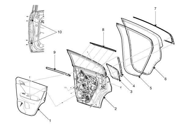 6. Caoutchouc d’étanchéité latéral de porte arrière 7. Moulure du cadre de porte arrière 8. Caoutchouc d’étanchéité externe du puits de porte arrière 9. Caoutchouc d’étanchéité interne du puits de porte arrière 10. Charnière de la porte arrière |