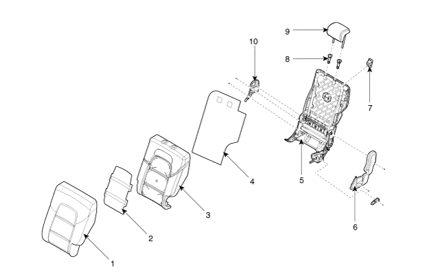 1. Housse du dossier de siège arrière 2. Chauffage de dossier de siège arrière 3. Rembourrage de dossier de siège arrière 4. Pare-poussières du dossier de siège arrière 5. Cadre du dossier de siège arrière 6. Housse interne du dossier de siège arrière |