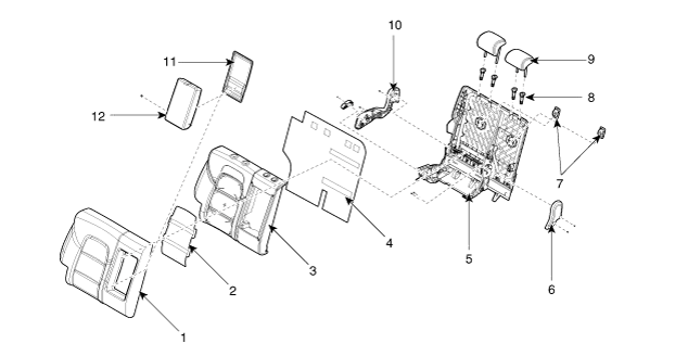 7. Revêtement du point d'ancrage du dossier de siège arrière 8. Guide d'appuie-tête de siège arrière 9. Appui-tête du siège arrière 10. Recouvrement externe de protection du dossier de siège arrière 11. Accoudoir de siège arrière 12. Panneau de l'accoudoir du siège arrière |