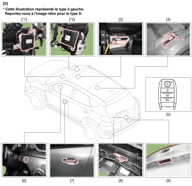6. Bouton Marche/Arrêt (SSB) 7. Poignée de porte et antenne de porte 8. Antenne du pare-chocs 9. Commutateur du couvercle du hayon |