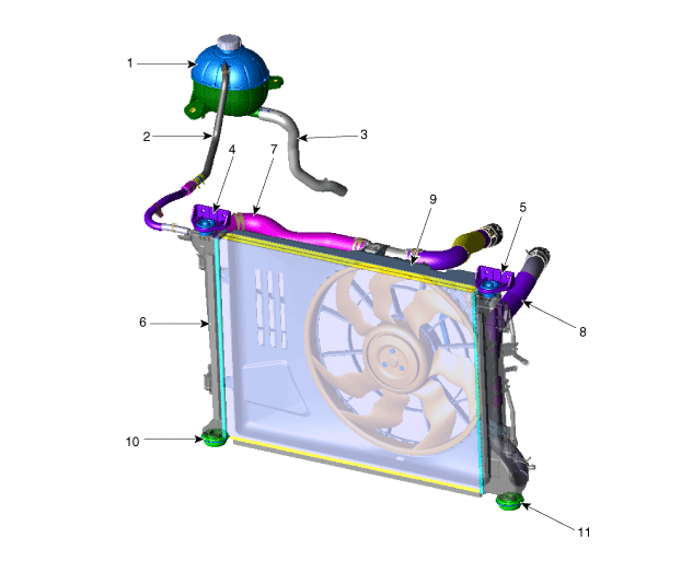 7. Flexible supérieur du radiateur 8. Durite inférieure du radiateur 9. Ensemble du ventilateur de refroidissement 10. Isolant inférieur de montage du radiateur [D] 11. Isolant inférieur de montage du radiateur [G] |