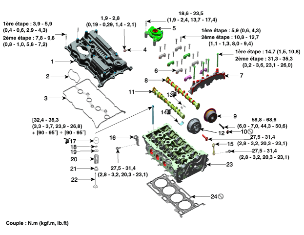 17. Régleur de jeu mécanique (MLA) 18. Goupille d'arrêt 19. Dispositif de retenue 20. Ressort de soupape 21. Joint de la tige de soupape 22. Soupape 23. Culasse 24. Joint de culasse |