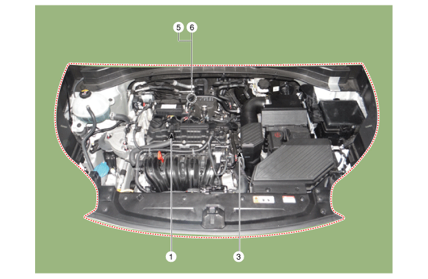 1. Soupape PCV 2. Canister 3. électrovanne de commande de purge (PCSV) 4. Filtre à air du réservoir de carburant 5. Convertisseur catalytique (WCC) |