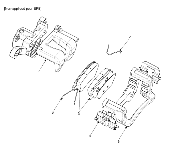 1. Corps de l'étrier 2. Ressort de rappel de plaquettes 3. Plaquette de frein |