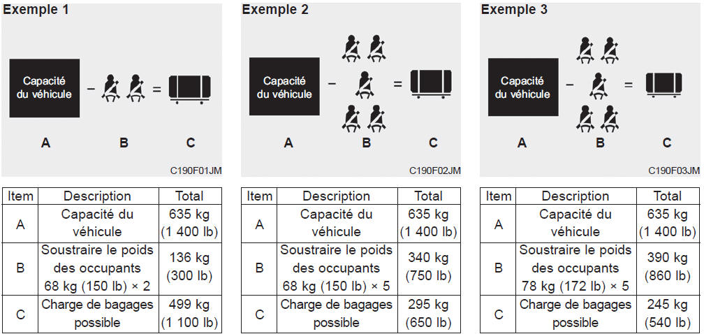 4.Le chiffre résultant est égal à la quantité de bagages permise. Par exemple, si le poids XXX est égal à 635 kg (1 400 lb) et qu'il y a cinq passagers pesant 68 kg (150 lb) dans le véhicule, la quantité de bagages permise serait de 295 kg (650 lb).
