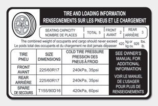 1.Relevez l'information " Le poids combiné des passagers et de la charge ne devrait jamais dépasser XXX kg ou XXX lb. " sur l'étiquette du véhicule.