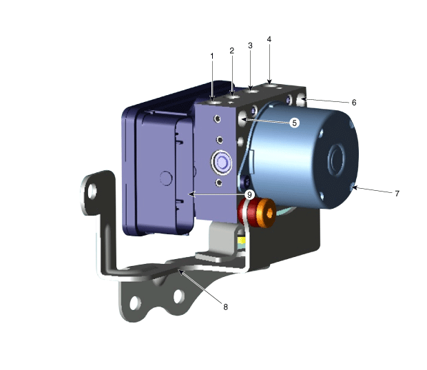 6. MC1 (PRI) 7. Module de contrôle de l'ESP (HECU) 8. Support 9. Connecteur du module de commande VDC |