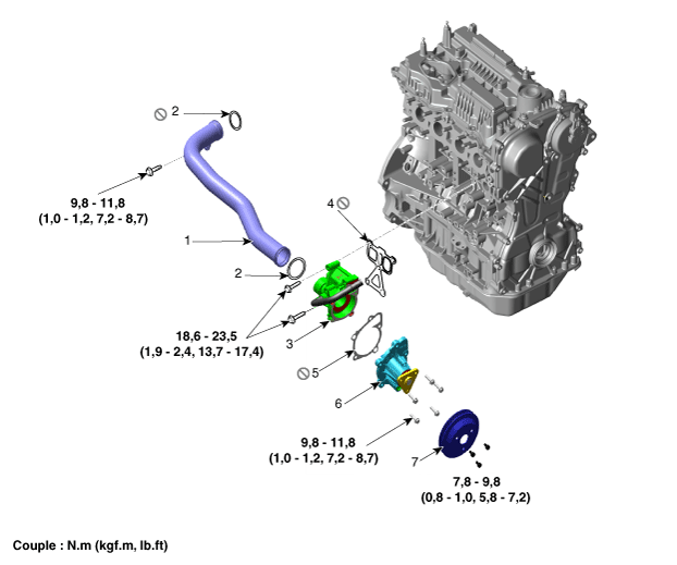 5. Joint de la pompe à eau 6. Pompe à eau 7. Poulie de la pompe à eau |