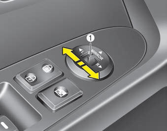 La télécommande électrique du rétroviseur permet d'ajuster la position des rétroviseurs extérieurs gauche et droit. Pour ajouster la position d'un rétroviseur, le commutateur d'allumage doit être sur ACC. Poussez le commutateur (1) sur R ou L pour choisir le rétroviseur droit ou gauche, puis appuyez sur le point correspondant pour ajuster le rétroviseur vers le haut, le bas, la gauche ou la droite.